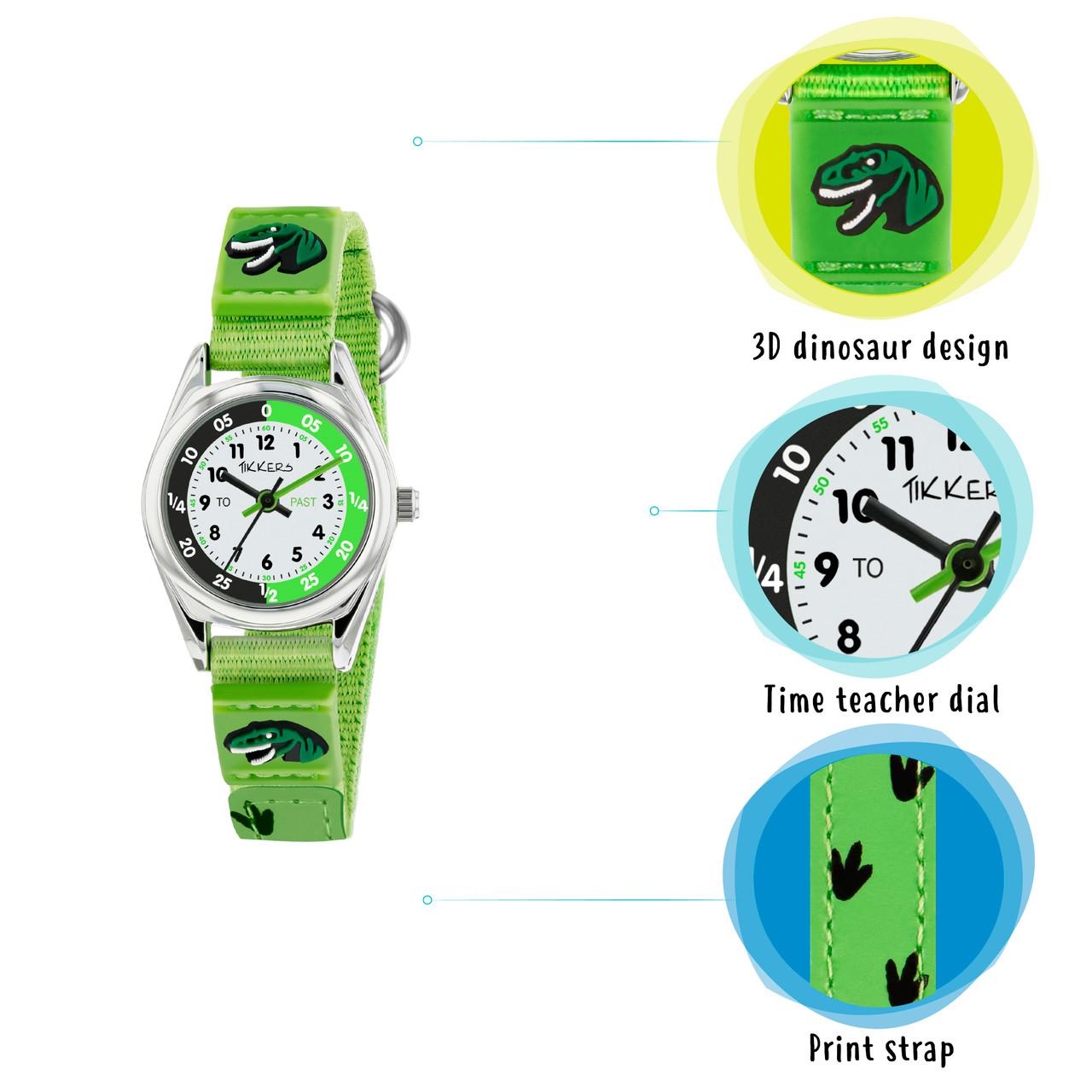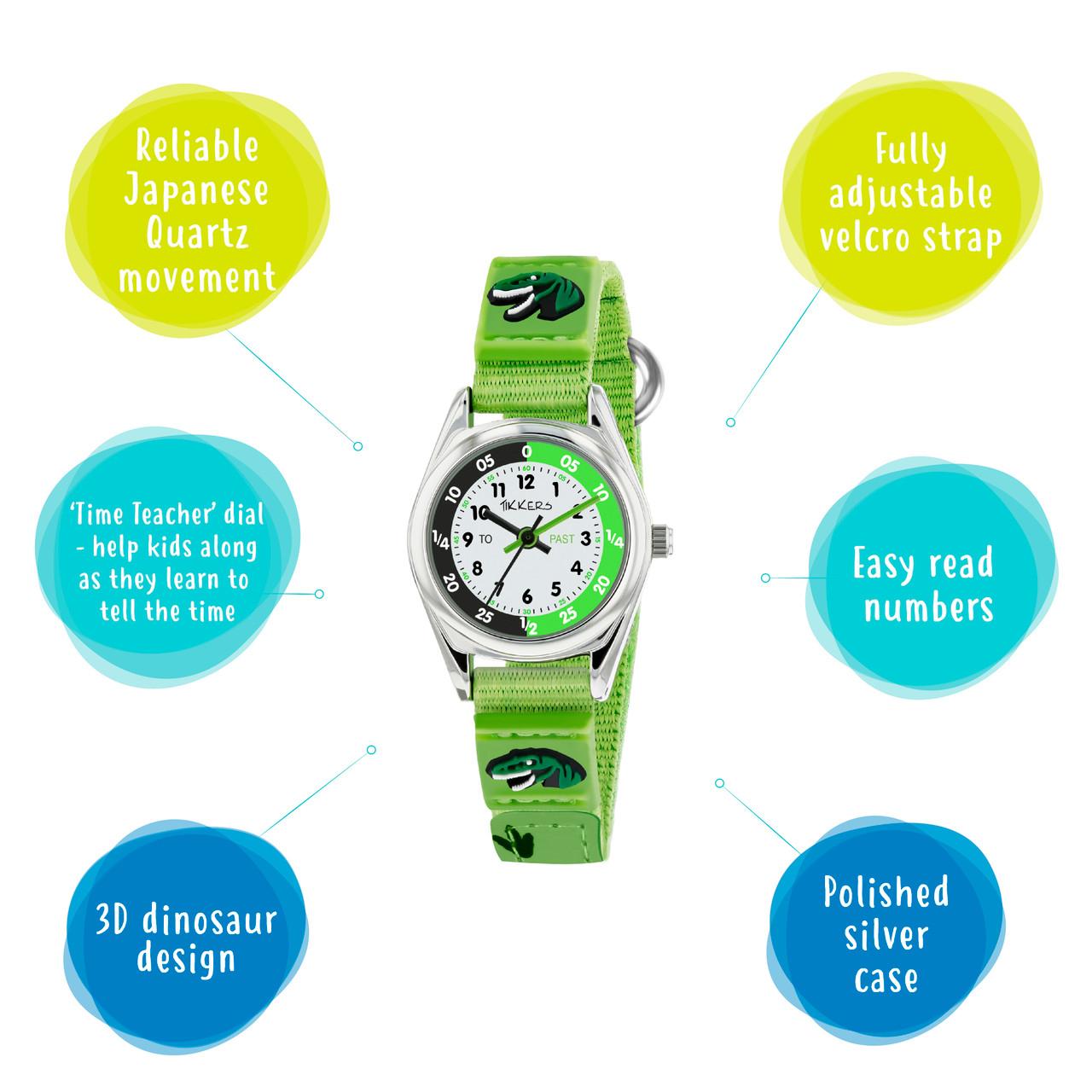One of our most popular time teachers, this style features an easy read dial with markings specially designed to help kids tell the time with confidence. The strap is made from soft canvas with 3D dinosaur detail and a self-fastening hook and loop closure which is easy for little ones to take on and off themselves. The dinky 25mm case makes this the perfect for younger children.