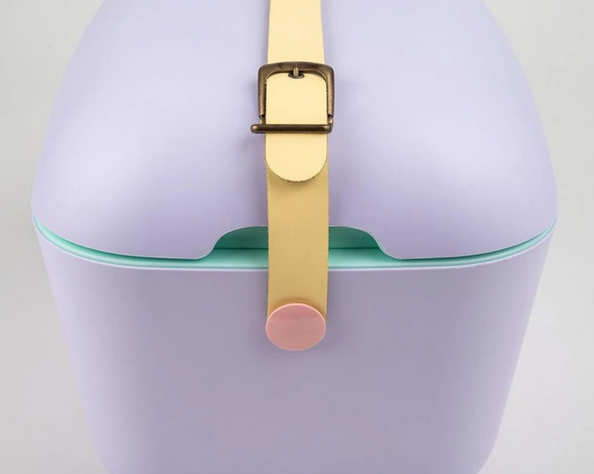 The adjustable leather strap adds convenience for carrying and the convertible lid doubles as a table-tray.